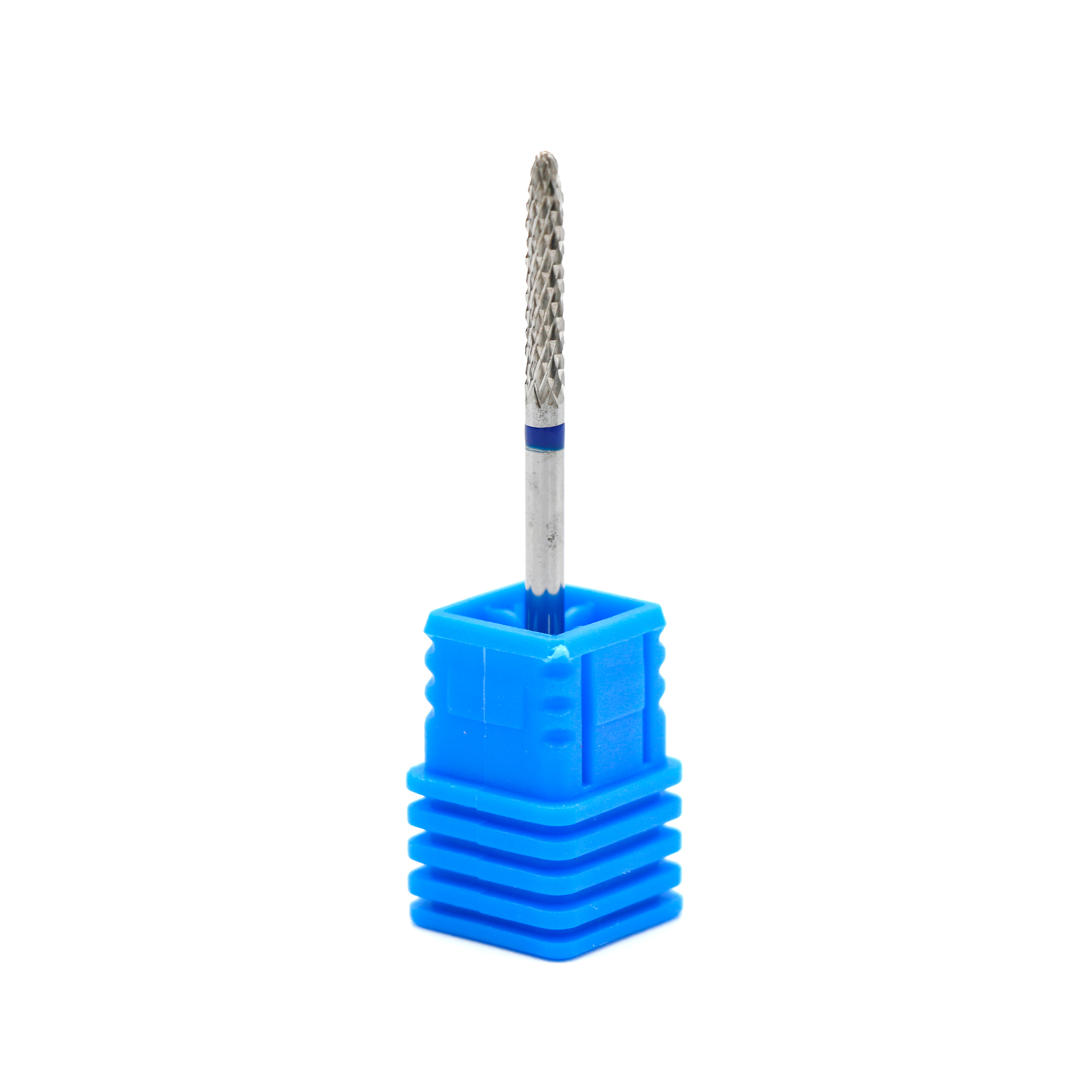 Твердосплавна насадка форми «полум'я» з синьою насічкою – це інструмент середньої жорсткості, який зазвичай використовується для корекції штучних нігтів, зняття гель-лаку та обробки ороговілої шкіри навколо нігтя.
