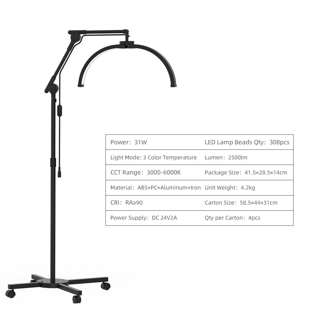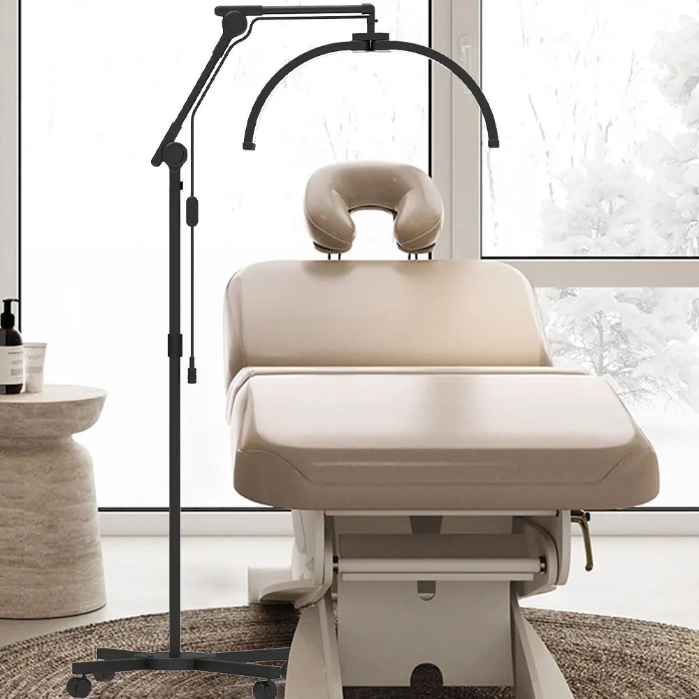 Безтіньова LED-лампа F-700D на штативі з формою світильника у вигляді дуги - універсальний освітлювальний пристрій для професійного застосування. Вона ідеально підходить для роботи стилістів, візажистів, майстрів з нарощування та ламінування вій, майстрів-бровістів, майстрів татуажу, косметологів та інших спеціалістів у галузі краси.