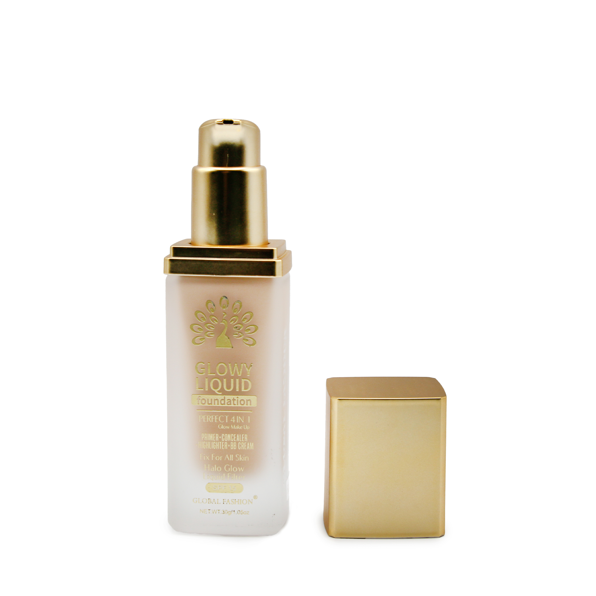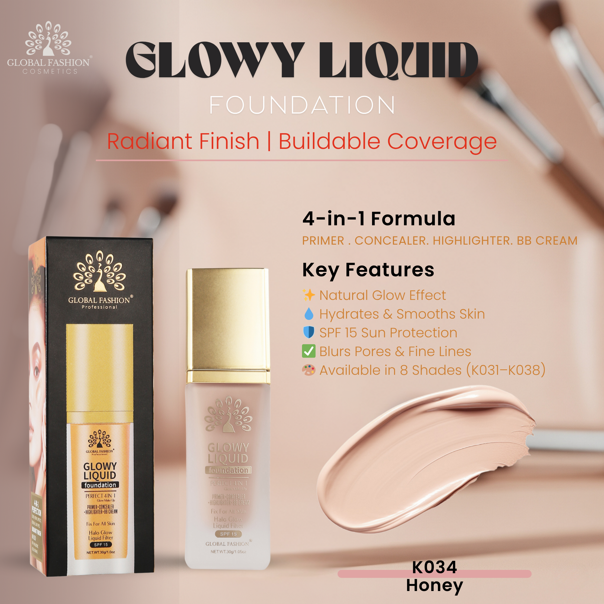 Жидкая тональная основа Glowy от Global Fashion — ваш секрет сияющей и ровной кожи в одном шаге. Уникальная 4-в-1 формула объединяет в себе свойства праймера, консилера, хайлайтера и увлажняющего BB-крема, обеспечивая безупречное покрытие, естественное сияние и комфорт на протяжении всего дня.