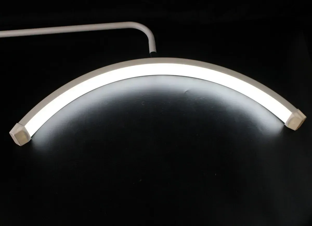 Основой этой лампы является технология, при которой светодиоды располагаются вдоль дуги. Это превращает ее в настоящую бестеневую лампу, способную равномерно и без теней осветить любую рабочую область. Лампа предлагает три режима светимости: естественный, теплый и холодный свет. Переключение между режимами осуществляется при помощи пульта, расположенного на шнуре питания. Также в комплекте поставляется пульт дистанционного управления, при помощи которого можно включать и выключать лампу, переключать режимы свечения. Это позволяет быстро и легко менять освещение в зависимости от задачи и предпочтений мастера.