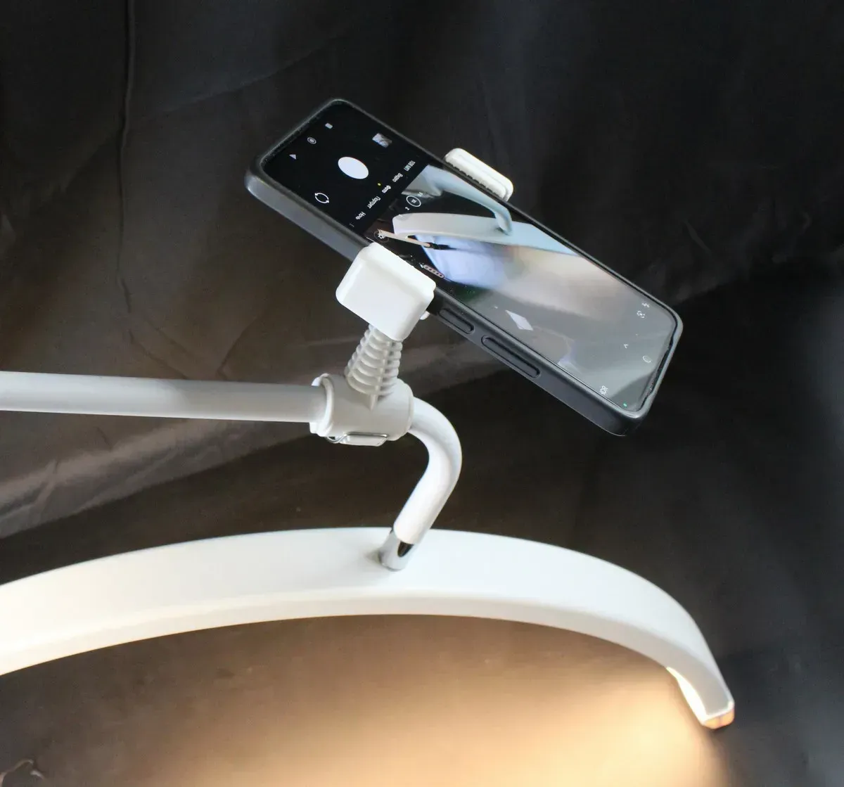 Штатив лампы телескопический, что позволяет регулировать высоту расположения светильника. В комплект лампы входит крепление для мобильного телефона для фотосъемки и записи видео.