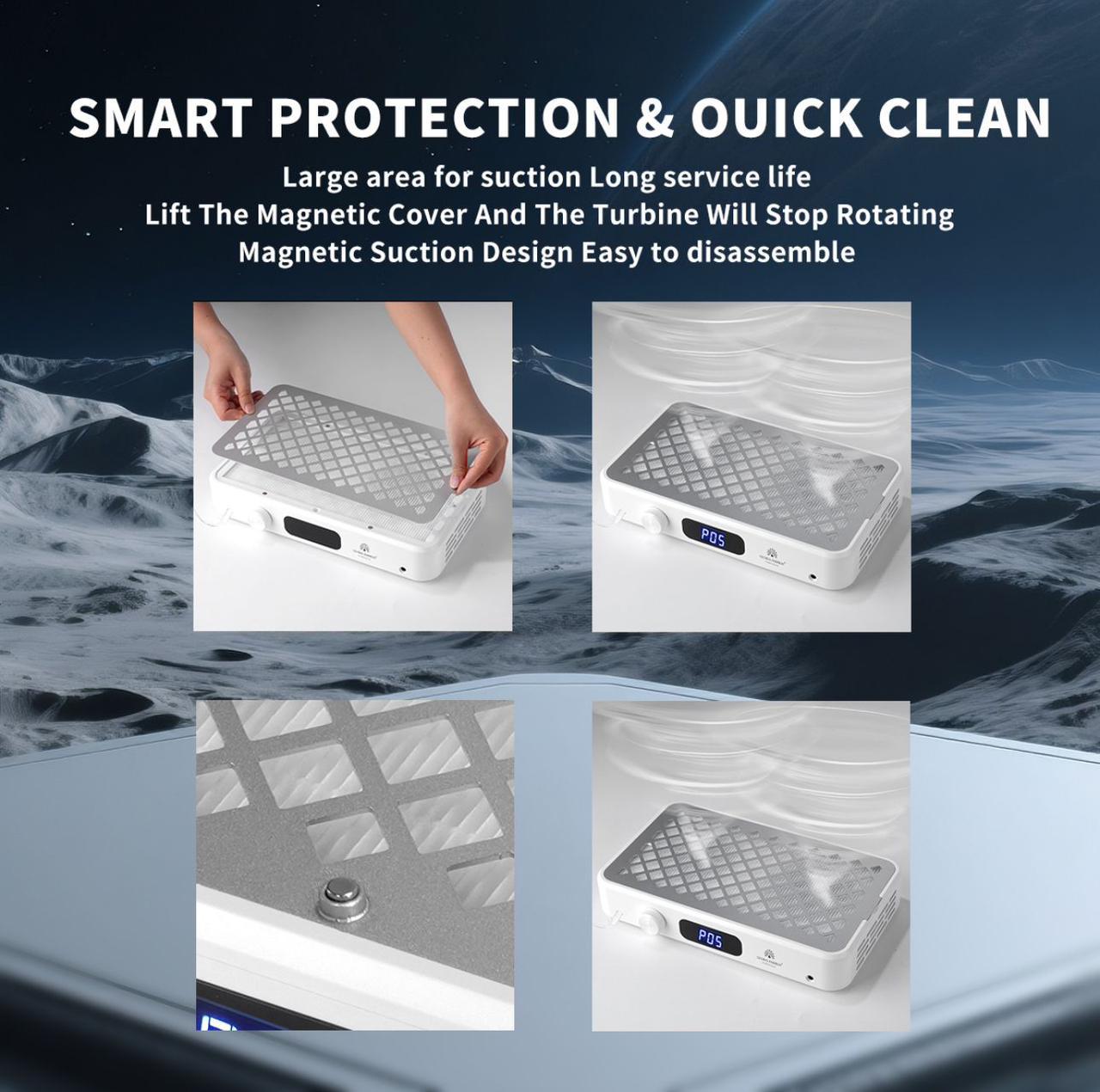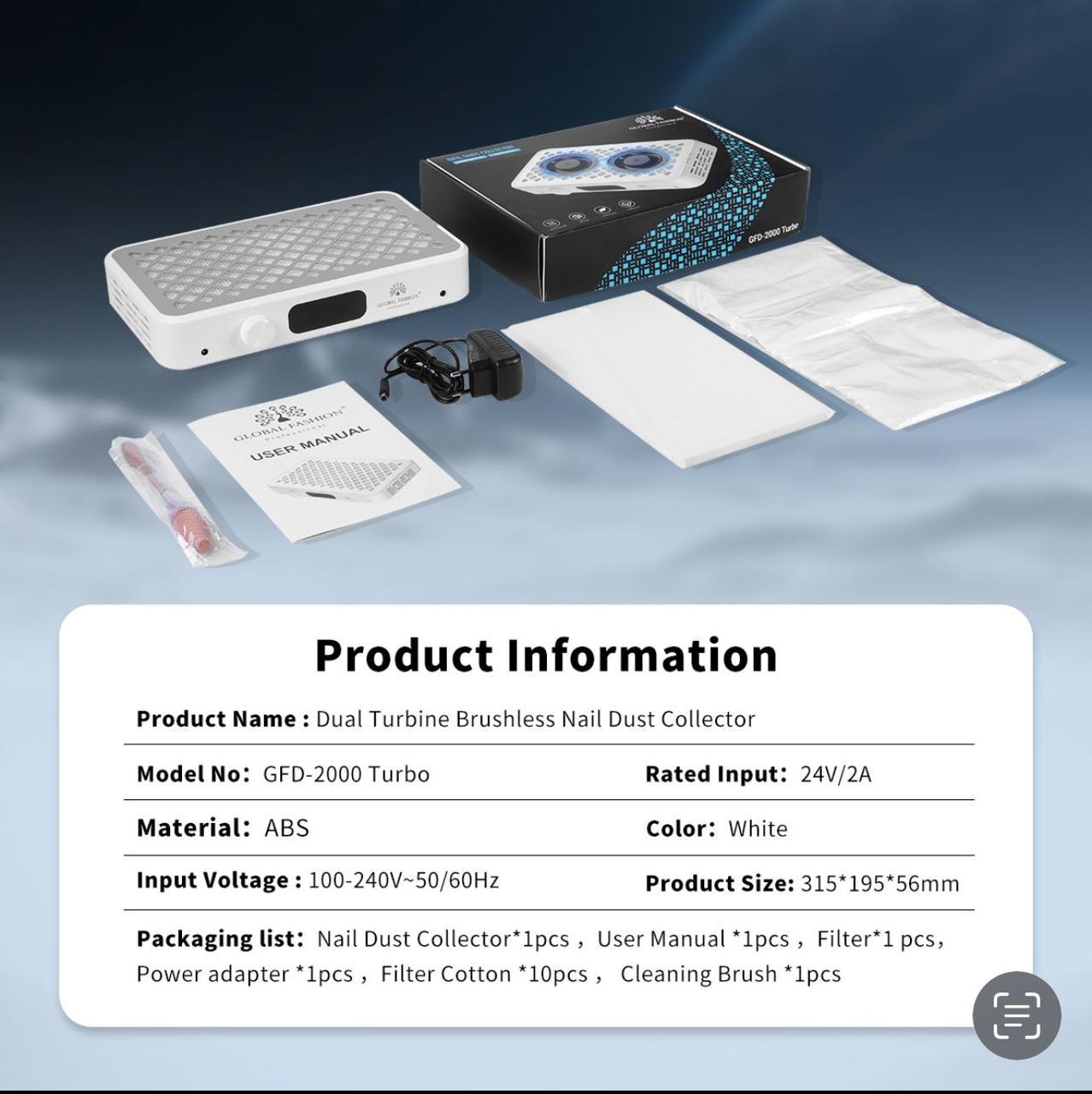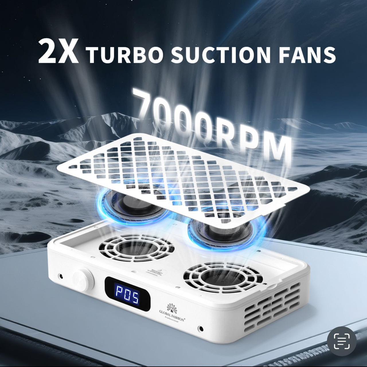 Вытяжка для маникюра GFD-2000 Turbo настольная с двумя вентиляторами, мощная 7000 об/мин, Global Fashion– идеальное решение для поддержания чистой и здоровой рабочей среды, эффективно устраняя пыль, образующуюся во время подпиливания и шлифования ногтей. Благодаря мощному двигателю 7000 об/мин и технологии бесщеточной турбины устройство обеспечивает превосходную силу всасывания без лишнего шума и длительный срок службы.