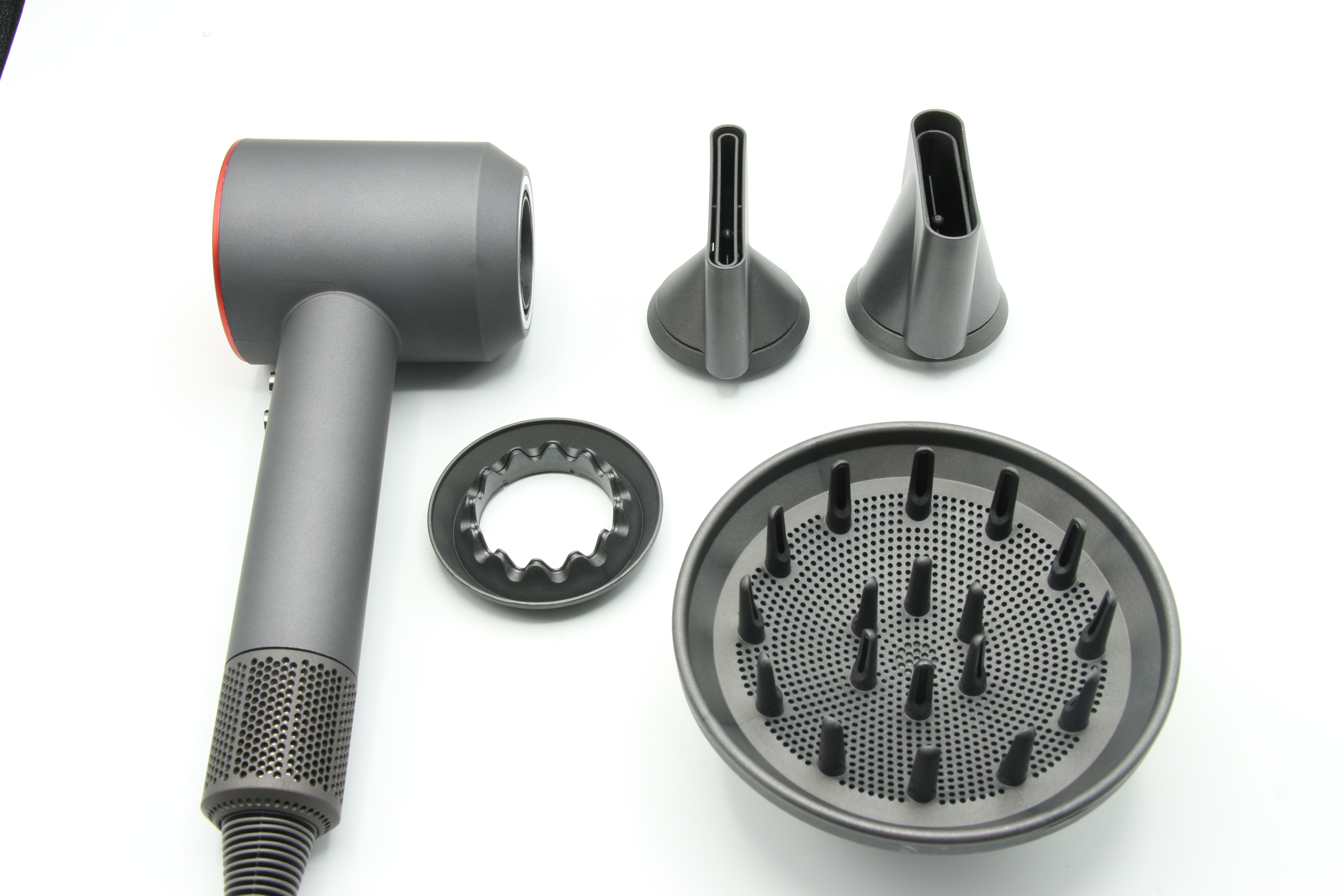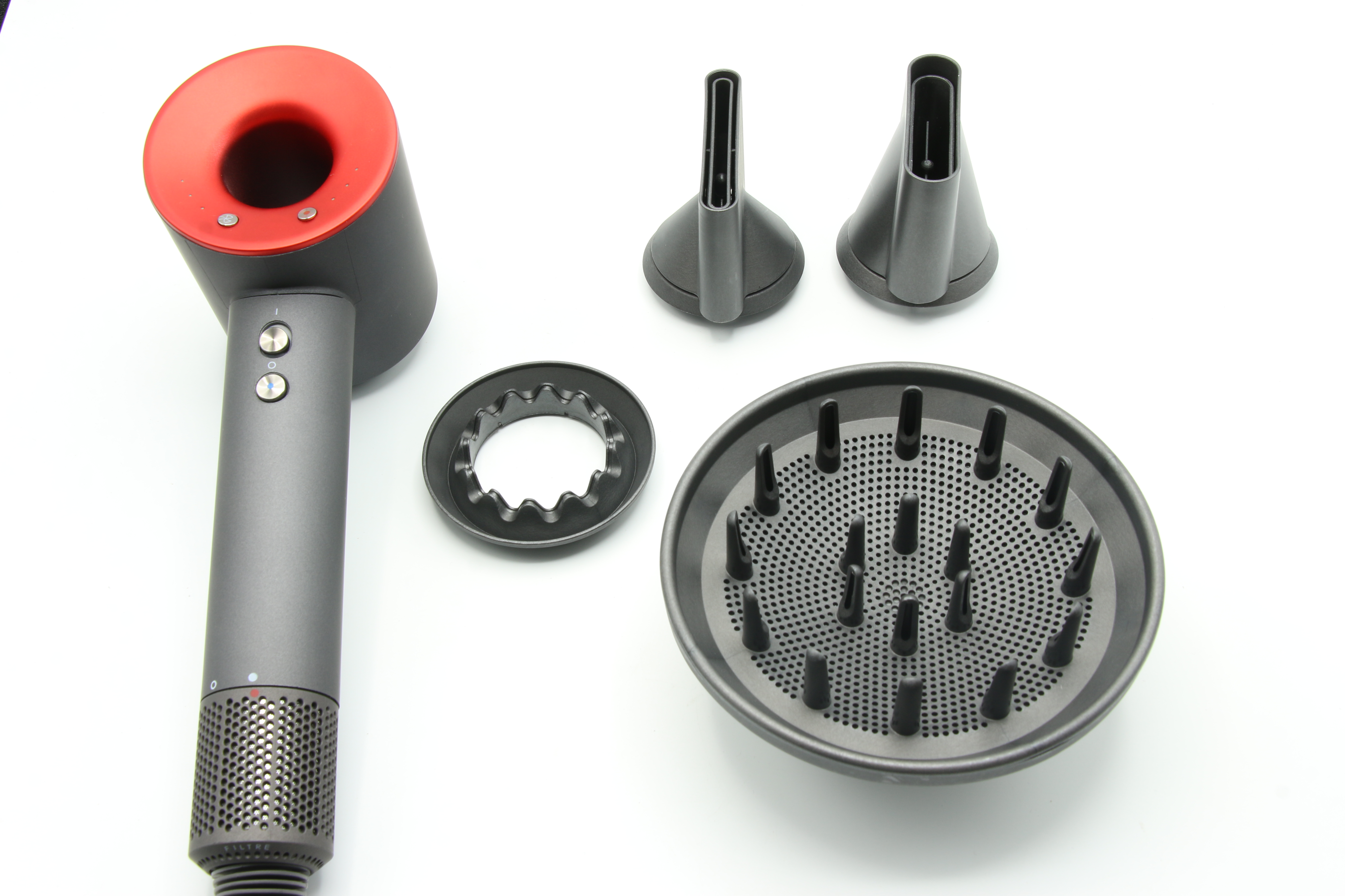 Интеллектуальное управление теплом. Микропроцессорная система интеллектуально управляет нагревательным элементом с помощью данных, передаваемых от термистора. Быстрая сушка. Цифровой двигатель V9 вращается до 110.000 оборотов в минуту при этом фен работает достаточно тихо. Насадки устанавливаются в отверстие, дополнительно фиксируется магнитом.