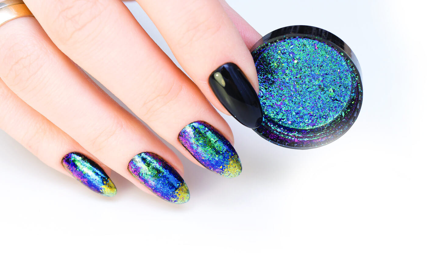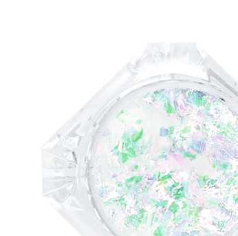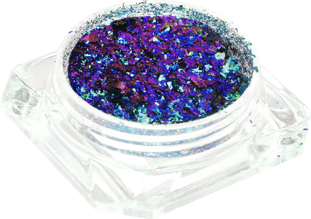 Это втирка, которая содержит нежнейшую фольгу, переливающуюся в абсолютно разные цвета под разными углами, в зависимости от освещения.