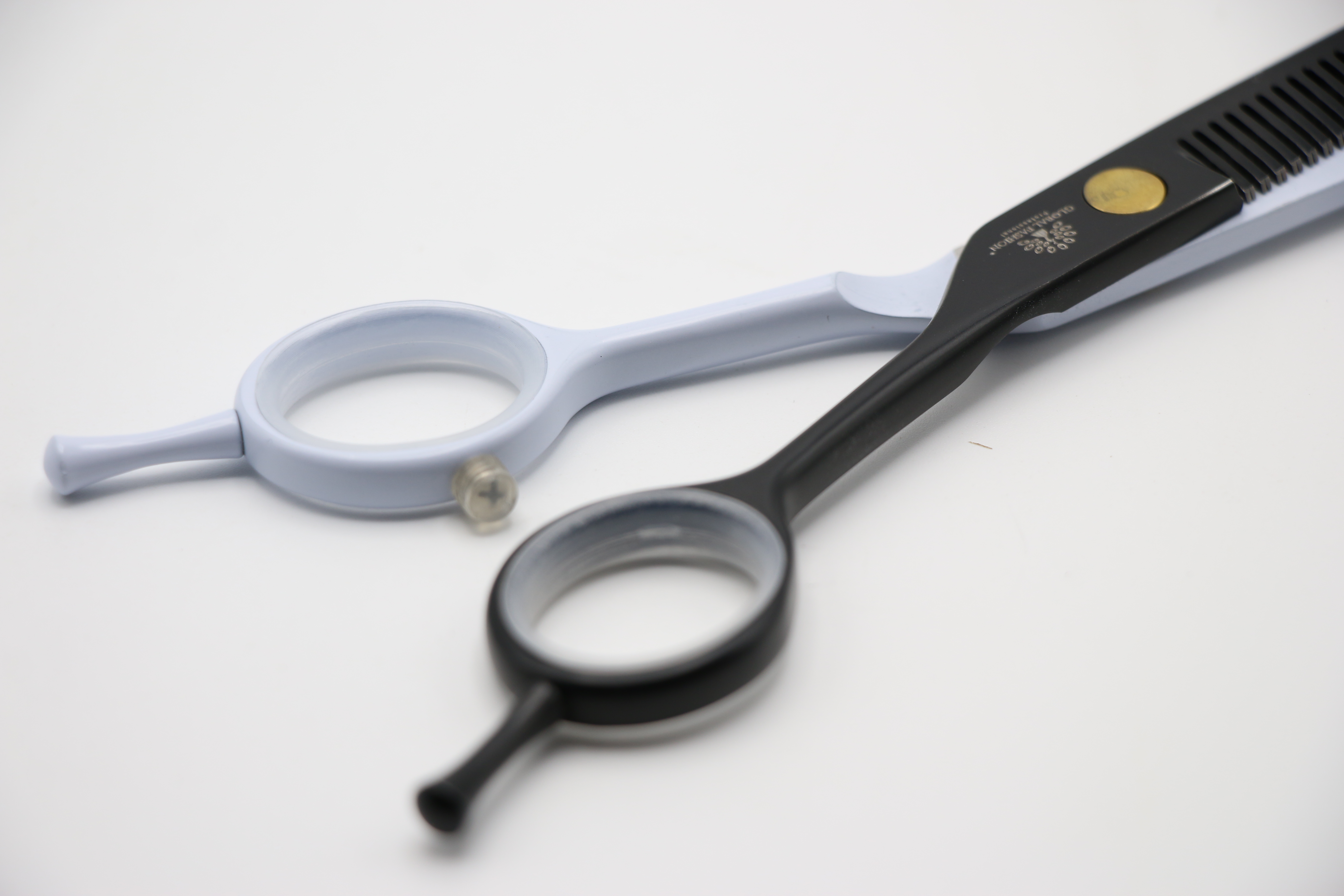 Ножницы разработаны таким образом, чтобы было легко регулировать натяжение. Имеет резинные вкладыши для резиновой рукоятки, соответствующие любым пальцам клиентам.
